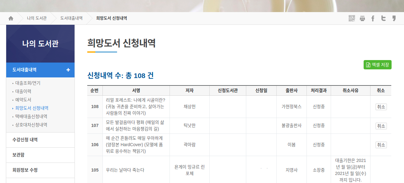 종종 취소되는 경우도 있지만, 그러면 다시 다른 책으로 신청할 수 있다.