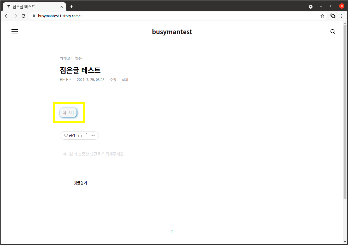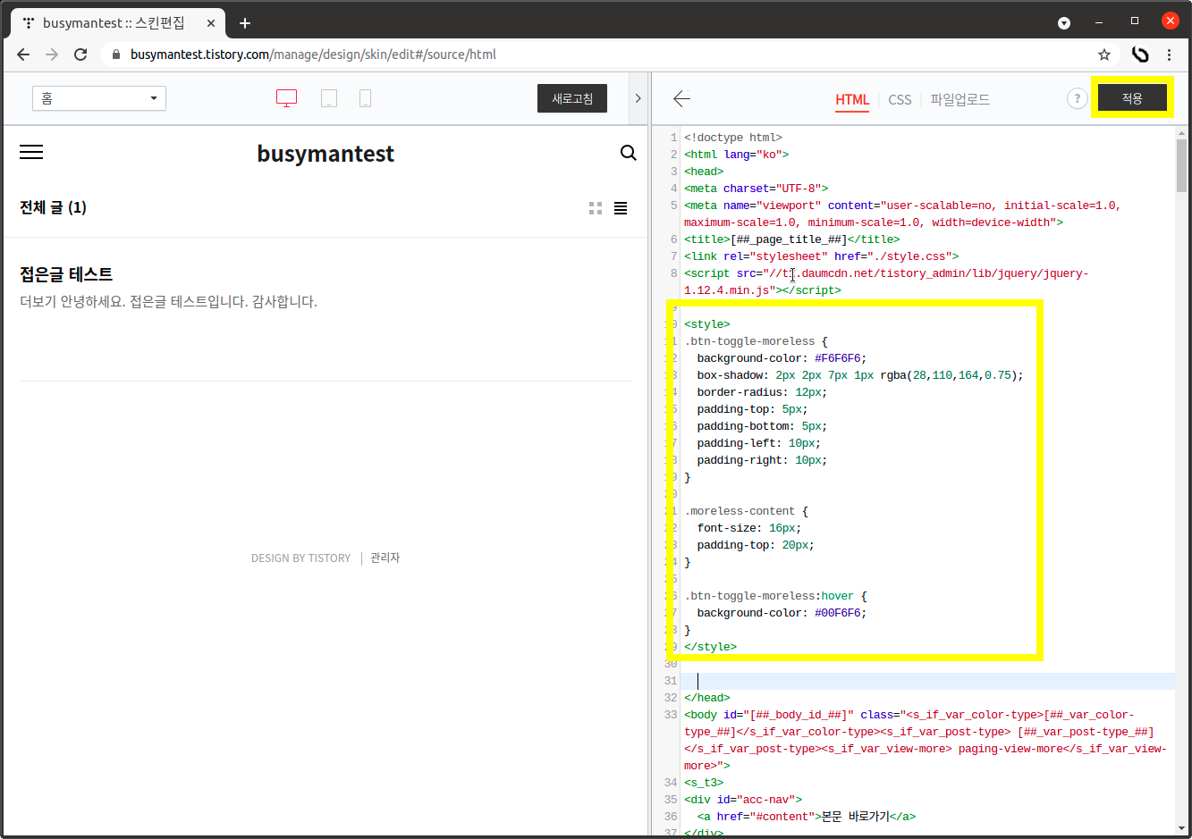티스토리 접은 글 모양이 예쁘지 않아 검색해서 자료를 찾아봤는데 적용이 잘 안되어 간략하게 정리해 보았다. 왕초보를 대상으로 했고 다양한 변경이 아니라 살짝 변경한 것이라 마음에 안들 수 있으니 더 꾸미고 싶으신 분은 css를 참조해서 변경하셔도 되고 다른 게시물을 찾아 적용하시면 됨.