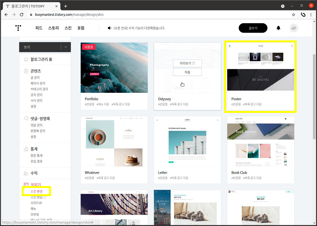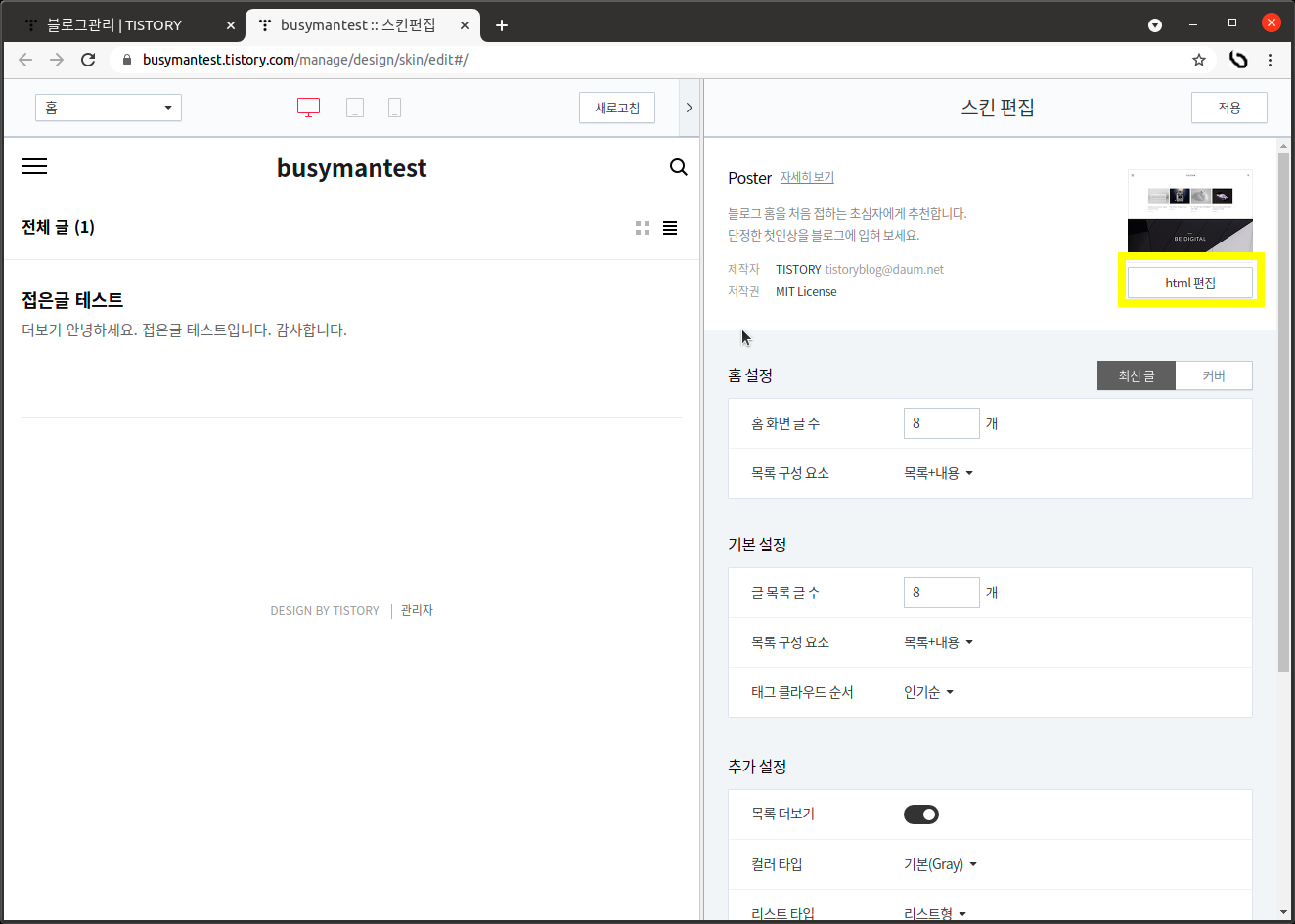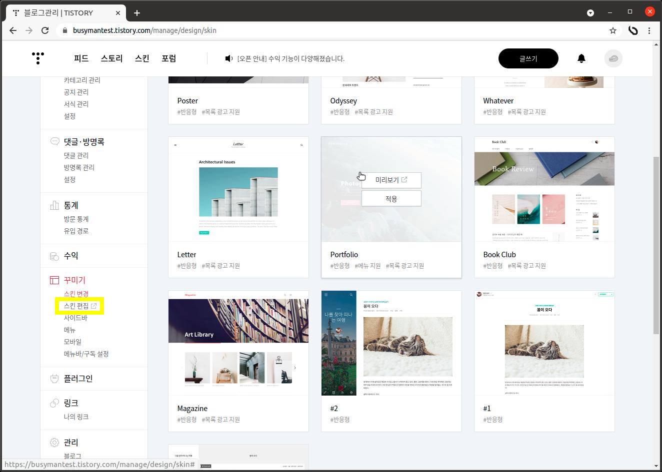 style 정보를 넣기 위해 스킨 편집 화면으로 이동한다.