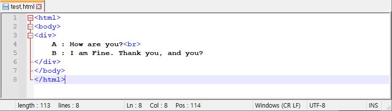 복잡한 수정은 아니고 화면의 "A : How are you?" 아래 "B : I am Fine. Thank you, and you?" 를 넣으려고 한다.