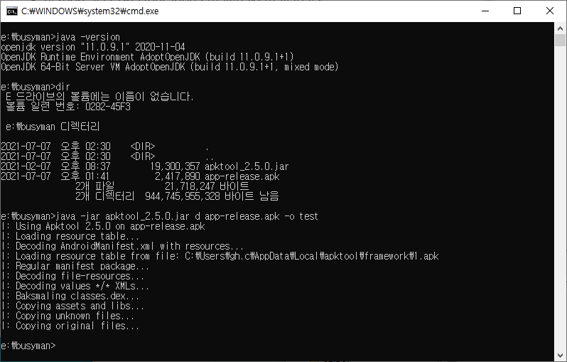 apktool_2.5.0.jar를 사용해서 변경된 파일을 다시 APK로 만든다.