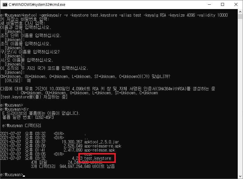keytool -genkeypair -v -keystore test.keystore -alias test -keyalg RSA -keysize 4096 -validity 10000