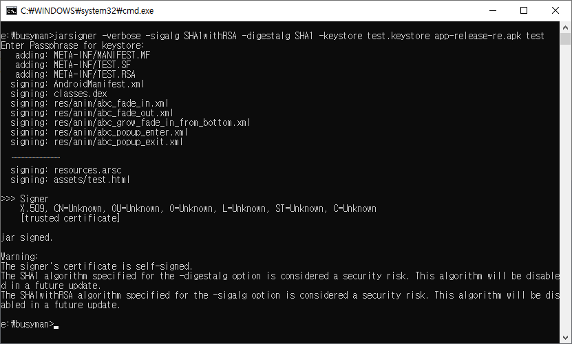생성한 키를 사용해서 서명한다. 서명에는 jarsigner.exe를 사용한다. (JDK에 포함되어 있음)
