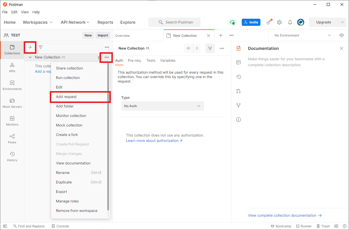 Workspaces를 대충 만들고 + (더하기) 모양을 클릭하면 Collection이 만들어진다. Collection의 우측 ˙˙˙ (쩜쩜쩜)을 눌러 'Add request'를 선택한다.