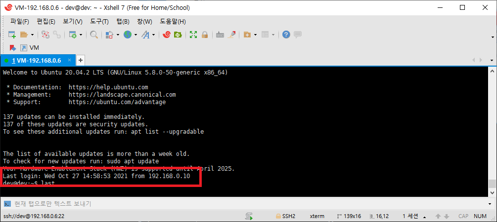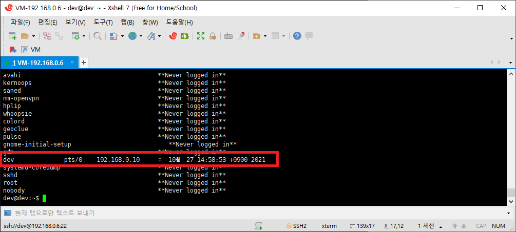 dev pts/0 192.168.0.10 수 10월 27 15:27:18 +0900 2021