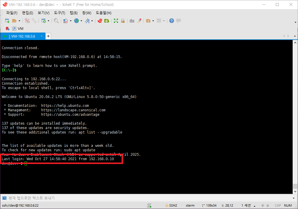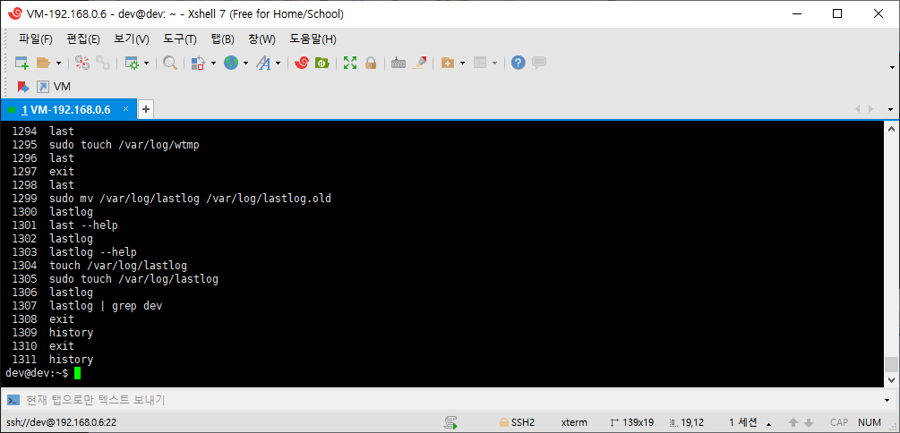 SSH 재접속 후, 당연히 다시 나오겠지만, 로그인 전까지는 기록이 없게 된다.