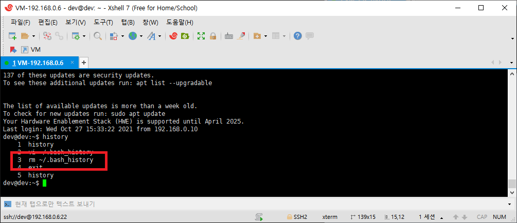 history는 원천적으로 지워야 한다. history 내용은 ~/.bash_history 파일 안에 들어 있다. 그럼 이 파일을 지워야겠다.