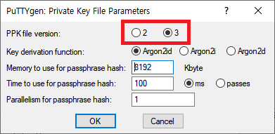 몇 번을 실패하다 인터넷 검색을 하니 ppk 만들 때 설정을 변경하라는 말이 있어서 해보았다. 아래와 같이 Key -> Parameters for saving key files.... 로 들어간다.