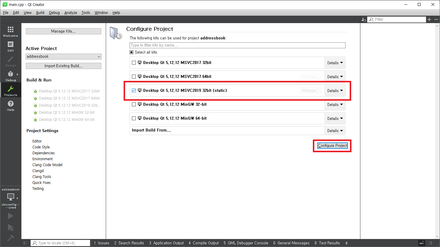 MSVC2019 Static Library를 빌드했고 QT Kit 추가도 했다.