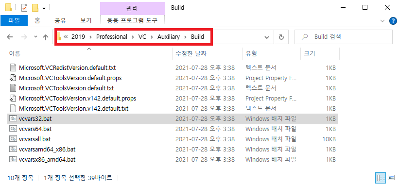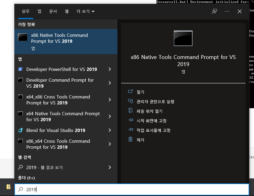 참고로 Command Prompt는 일반 Command Prompt가 아니라 아래와 같이 Visual Studio 개발환경이 설정된 것으로 사용한다. 만약 아래와 같이 찾을 수 없다면, 일반 Command Prompt 실행 후 Visual Studio 설치 위치에서 다음과 같은 batch 파일을 찾을 수 있다. 원하는 환경에 맞는 batch 파일을 실행하면 된다.