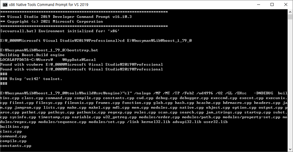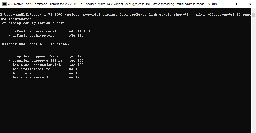 b2 toolset=msvc-14.2 variant=debug,release link=static threading=multi address-model=32 runtime-link=shared
