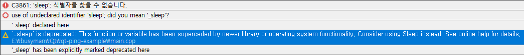 Qt에서 sleep() 함수를 사용하면 아래와 같이 에러가 난다.